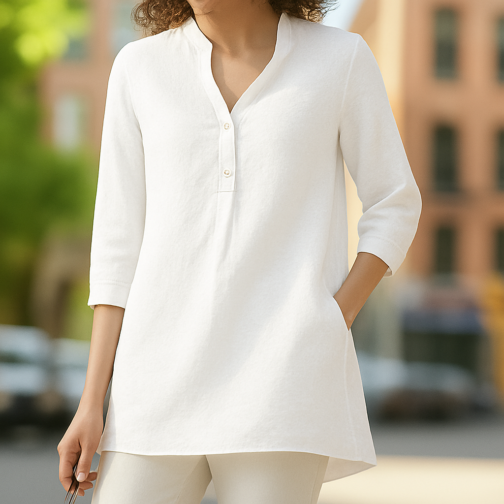 ✔ Effortless Fit & Flow – The subtle V-neck, button-down detail, and relaxed cut create a silhouette that flatters without trying too hard. It's style made simple.